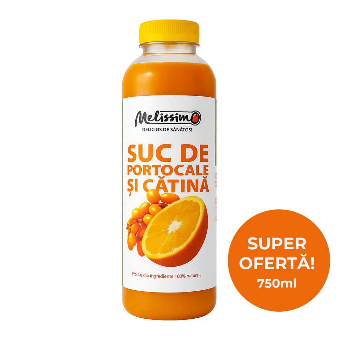 Ingrediente: 90% suc de portocale; 10% suc de cătină bio.