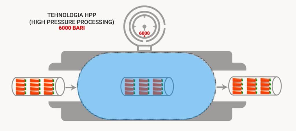 HPP este o tehnică de pasteurizare la rece care se aplică după ambalare, iar recipientul este supus unei presiuni de peste 6000 bari.
